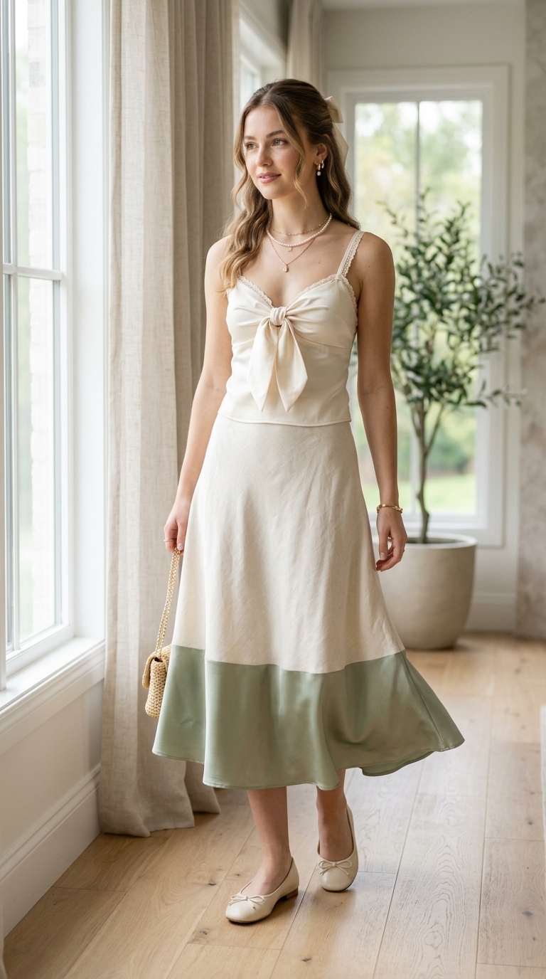 A two-tone skirt with a sage or blush accent brings that soft-pretty, “borrowed from Pinterest” energy, especially when paired with a bow-front top that sits perfectly at the waist. The styling feels delicate but confident, finished with dainty jewelry and classic flats. This look is a sweet go-to for events, date nights, or any day you want to feel feminine and photo-ready.