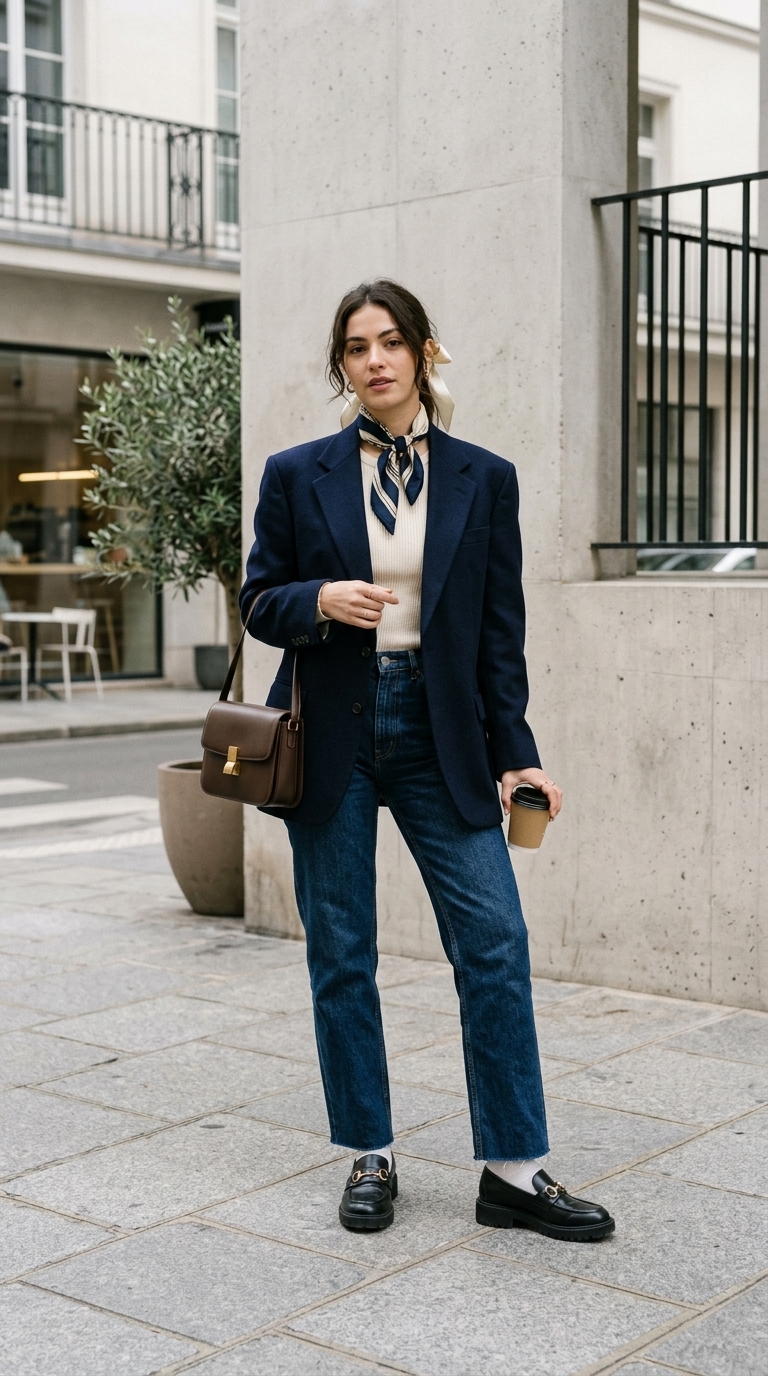An oversized blazer in deep navy instantly sharpens the whole look, especially when it’s worn over a fitted cream ribbed knit for contrast. Straight jeans and sleek loafers keep it street-style cool, while the shoulder bag makes it feel ready for real life. This outfit is a Pinterest favorite because it screams “put together” and looks amazing from every angle.