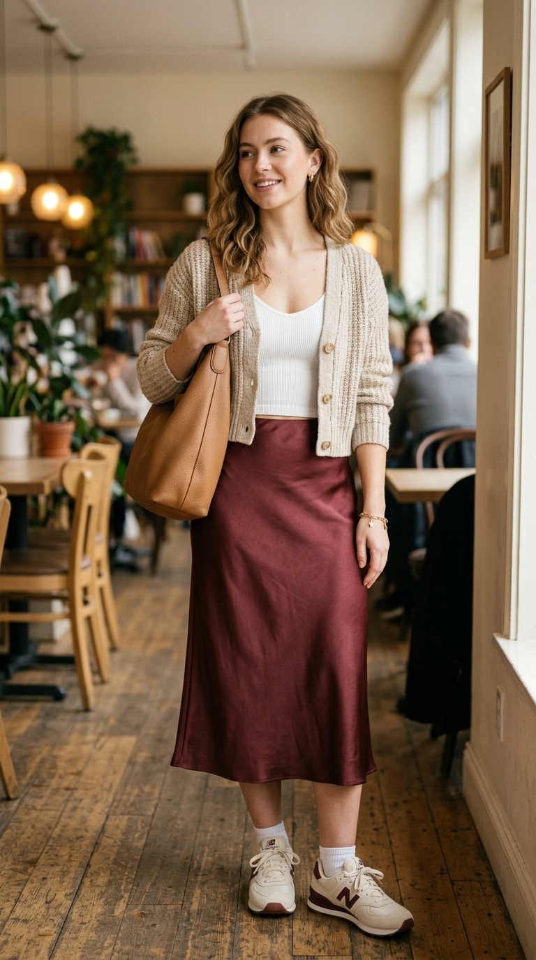 A mauve satin slip skirt brings instant movement, and the cropped oatmeal cardigan makes it feel cozy-cute instead of too dressed up. The combination looks effortlessly styled, with the soft sheen of the skirt and the knit texture of the cardigan doing the heavy lifting. It’s perfect for brunch, casual dates, or class days when you want to feel feminine and confident.