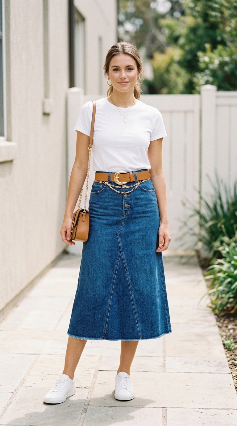 A tucked white tee keeps the top clean and casual, while the denim midi adds that Pinterest-approved “grown but still cute” silhouette. The statement tan belt pulls the whole look together and defines the waist for a flattering shape. It’s a go-to formula because it’s easy to restyle, looks great in photos, and works for almost any plan.