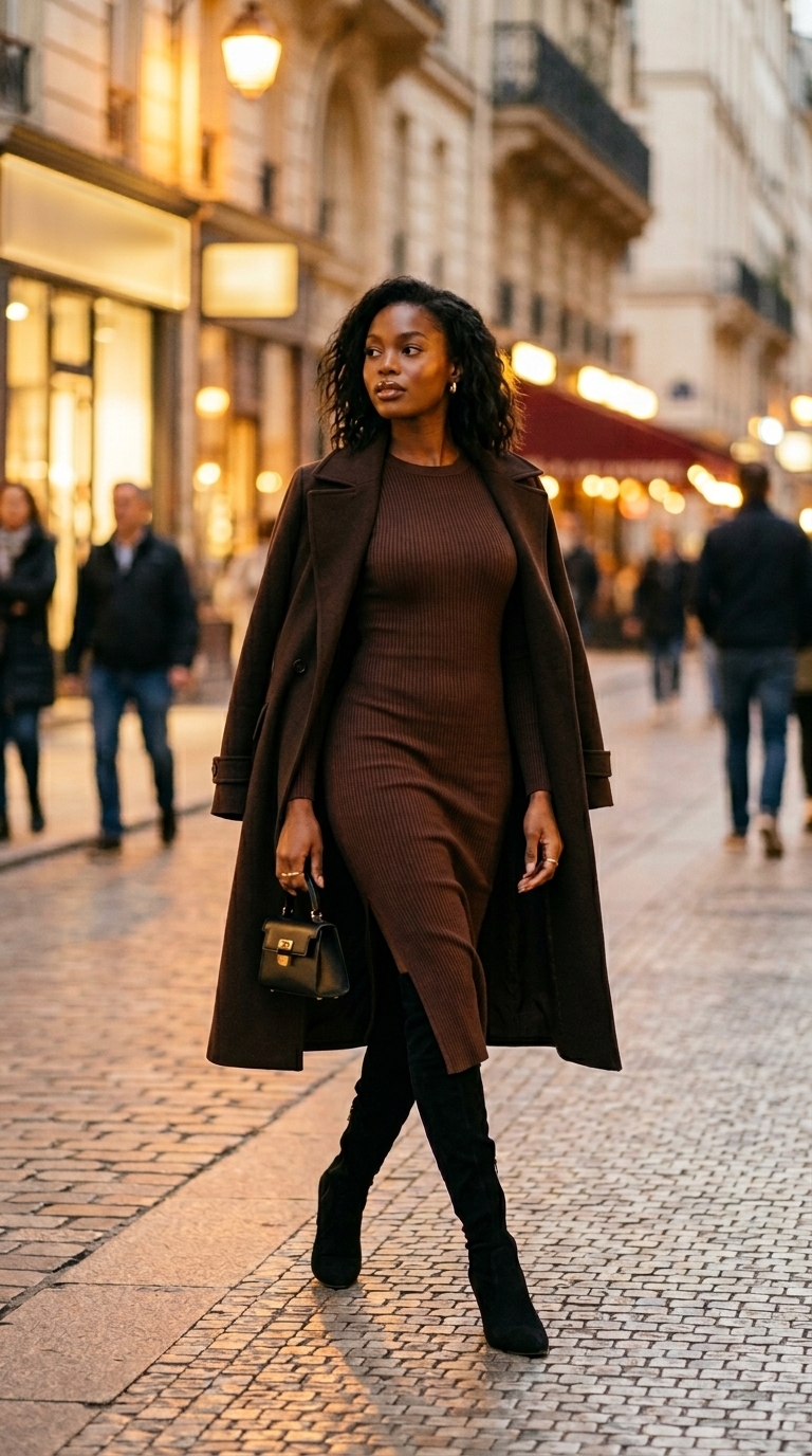 A ribbed knit midi dress in espresso looks smooth and expensive, especially when paired with fitted thigh-high boots that elongate your silhouette. Add a mini structured bag and a long coat moment for that “date-night but make it Pinterest” energy. It’s a confidence look that photographs like a dream—clean lines, bold texture, and instant wow without overthinking.