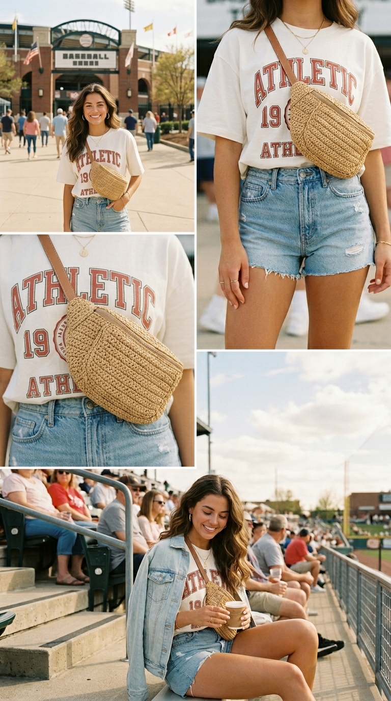 Accessories are what make your outfit feel “ready for the game” instead of just casual. A cap keeps hair and sun under control, a bandana adds that street-style charm, and a cute crossbody makes everything feel intentional. This styling set is easy to copy and instantly upgrades any spring baseball look.