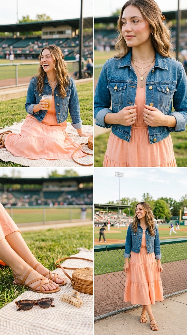 A breezy sundress gives you stadium-ready ease, and the cropped denim jacket makes it feel grounded instead of too delicate. Choose a peachy tiered skirt for movement while you walk the concourse, then finish with tan sandals and minimal jewelry. It’s sweet, chic, and looks amazing in spring photos—soft glam without the fuss.