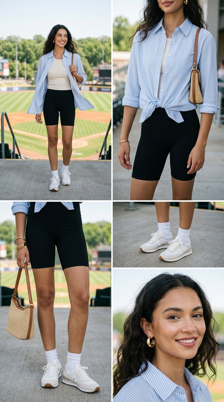 Open a crisp button-up over bike shorts to get that effortless “sporty but styled” look. The knotted waist creates shape, while the striped fabric brings spring energy that looks great in candid photos. Finish with sleek sneakers and earrings that catch the light—cool, confident, and totally game-day practical.