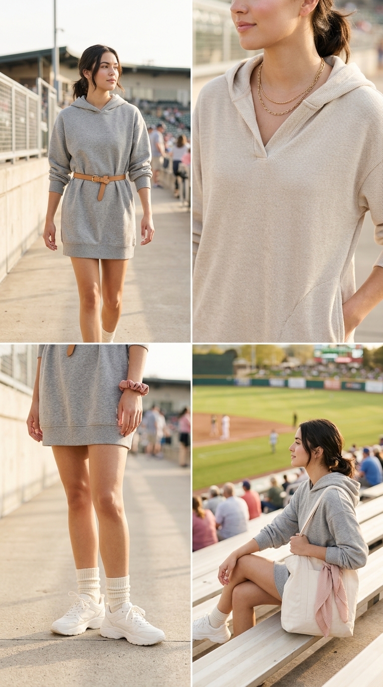 A hoodie dress makes game day feel like lounging—only it looks elevated. The oversized silhouette is comfy for walking and sitting, while crew socks and chunky sneakers keep it styled and modern. Add layered gold jewelry and a tote, and you’ve got an outfit that reads effortlessly cool in every photo.