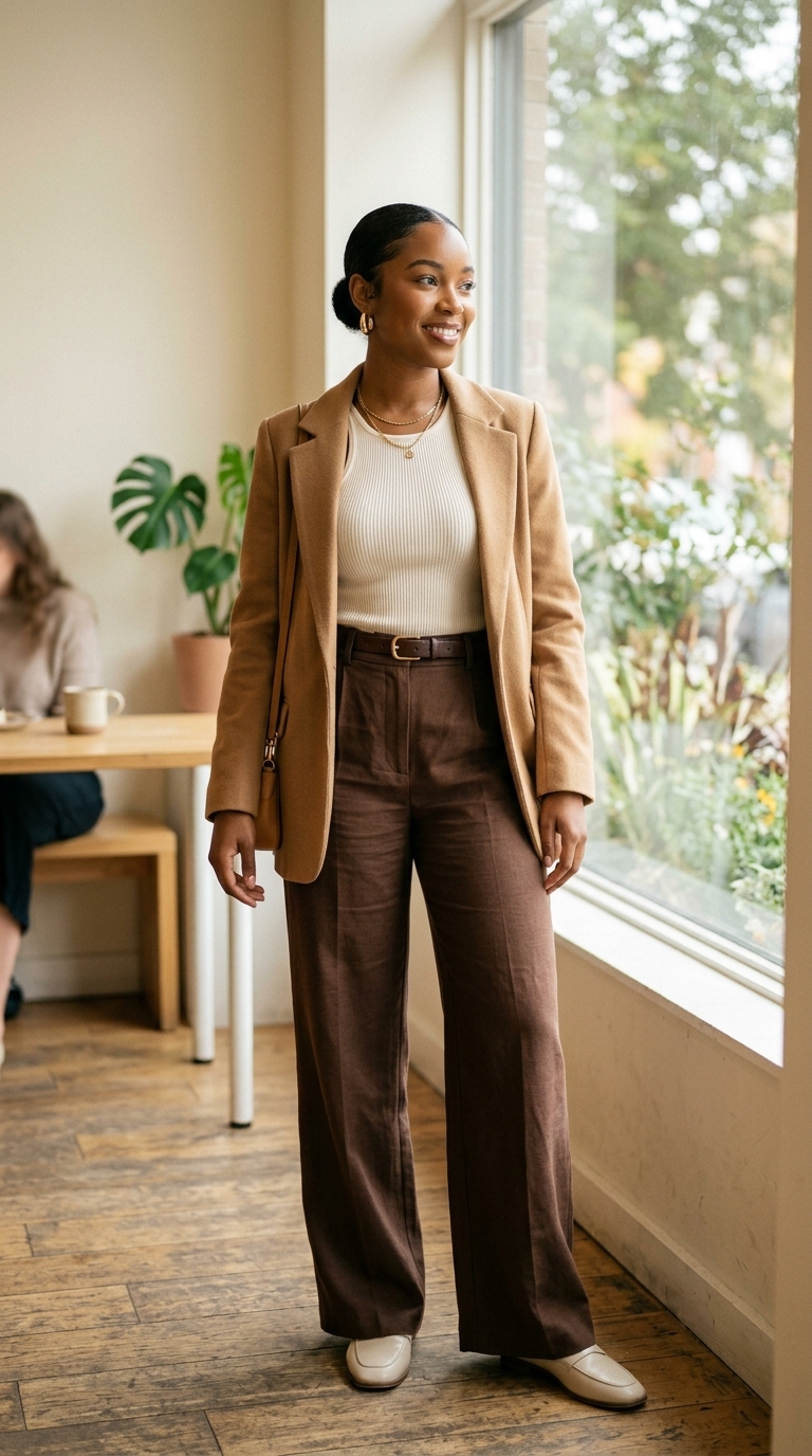 A fitted ribbed cream tank is tucked into high-waisted chocolate wide-leg trousers, finished with a camel blazer draped open for that “I planned this” energy. Gold hoops and a glossy nude lip keep the look modern and approachable, while the clean cafe backdrop makes it Pinterest-ready for real life. It’s the kind of outfit that feels effortlessly elevated—because the fit does all the work.