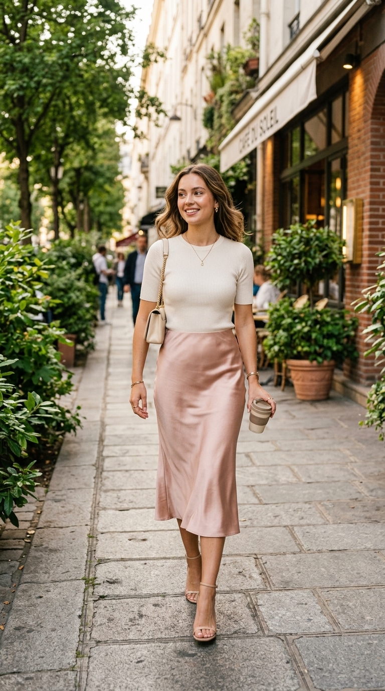 2. Satin Midi Skirt + Fitted Knit Top for instant main character energy