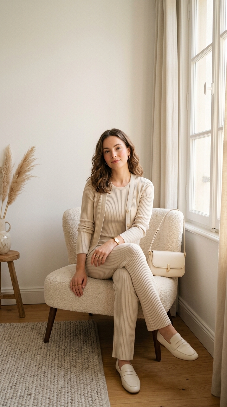 A monochrome oat ribbed set instantly looks curated—like your closet has a theme and you’re the main character of it. The matching textures read luxe on camera, and the relaxed tailoring keeps it wearable from day to night. With simple jewelry and a clean neutral background, the whole look feels expensive without needing loud pieces.