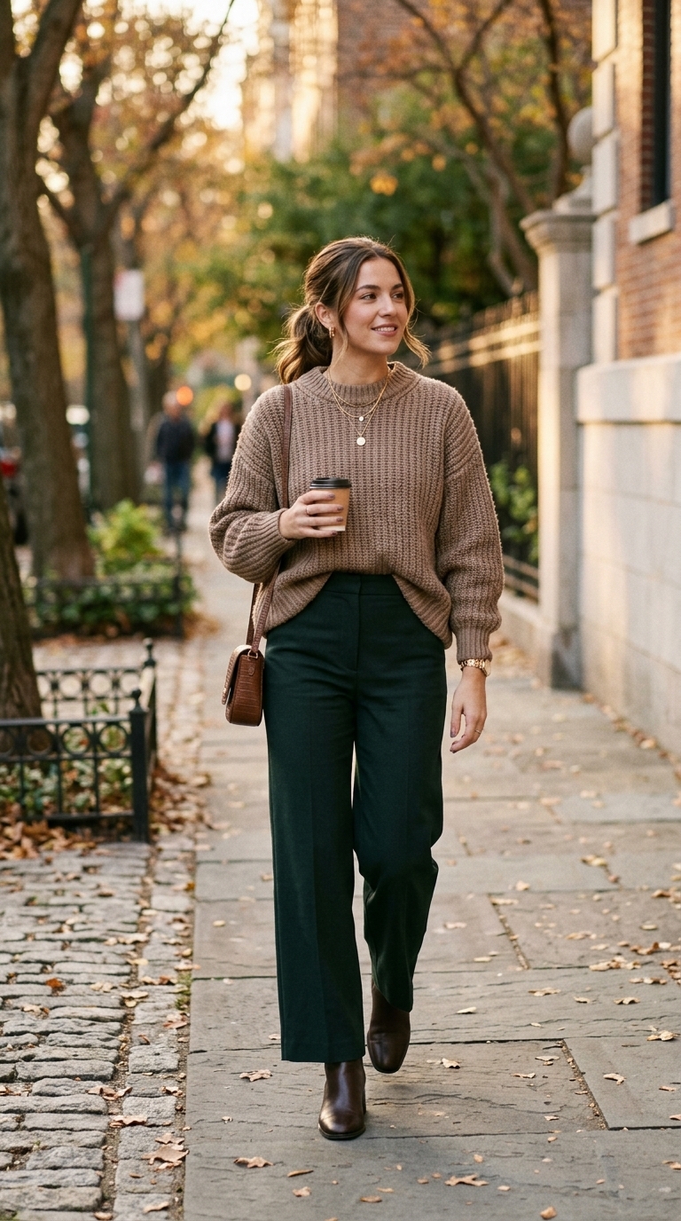 An oversized taupe sweater gets that “that girl” balance when it’s tucked just enough to show the waist, paired with high-waist trousers that elongate your silhouette. The look is cozy but styled—knit texture, clean lines, and an intentional fit that reads confident. It’s perfect for when you want comfort to look elevated, not sloppy.