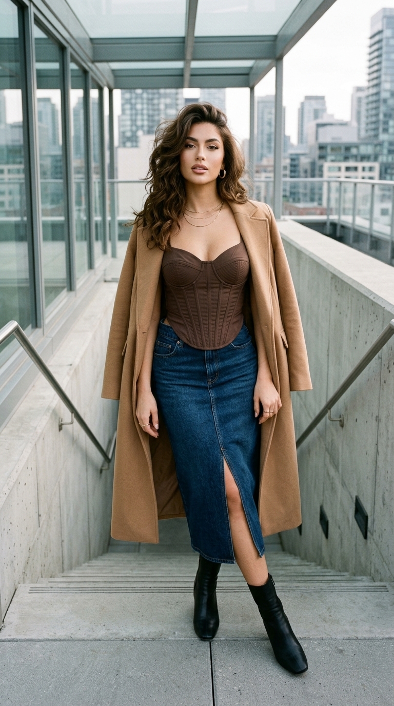 A corset-inspired top creates instant structure, cinching the waist while still feeling wearable with simple bottoms like straight-leg denim or tailored trousers. The contrast between structured top and clean bottom lines looks elevated and intentional, especially in natural light. It’s the “snatched but stylish” outfit that turns any plan into a moment.