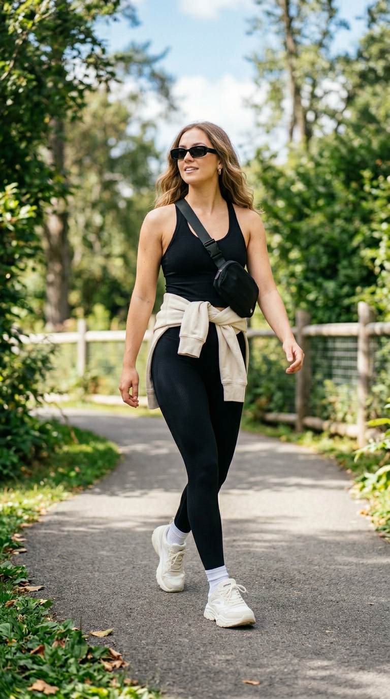 A neutral hoodie tied at the waist instantly makes athleisure look styled instead of sleepy, paired with high-waisted leggings and chunky sneakers for that Gen Z comfort-meets-cool vibe. A crossbody and sunglasses add polish without losing the relaxed feel. This is the outfit that gets you compliments for simply going about your day—effortless, practical, and still cute in photos.