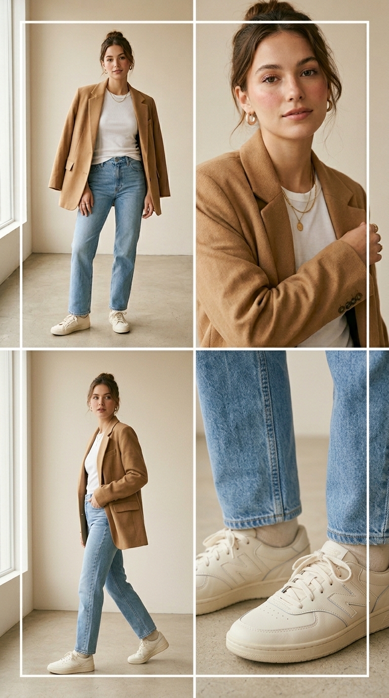 Oversized camel blazer energy with a soft white tee underneath—easy structure, zero stiffness. Pair it with light-wash straight-leg denim and cream sneakers for a look that photographs like runway street style but still feels casual enough for real life. Natural glam (warm bronzer, glossy nude lip) ties it together for “undone elegance” that reads confident, not careless.