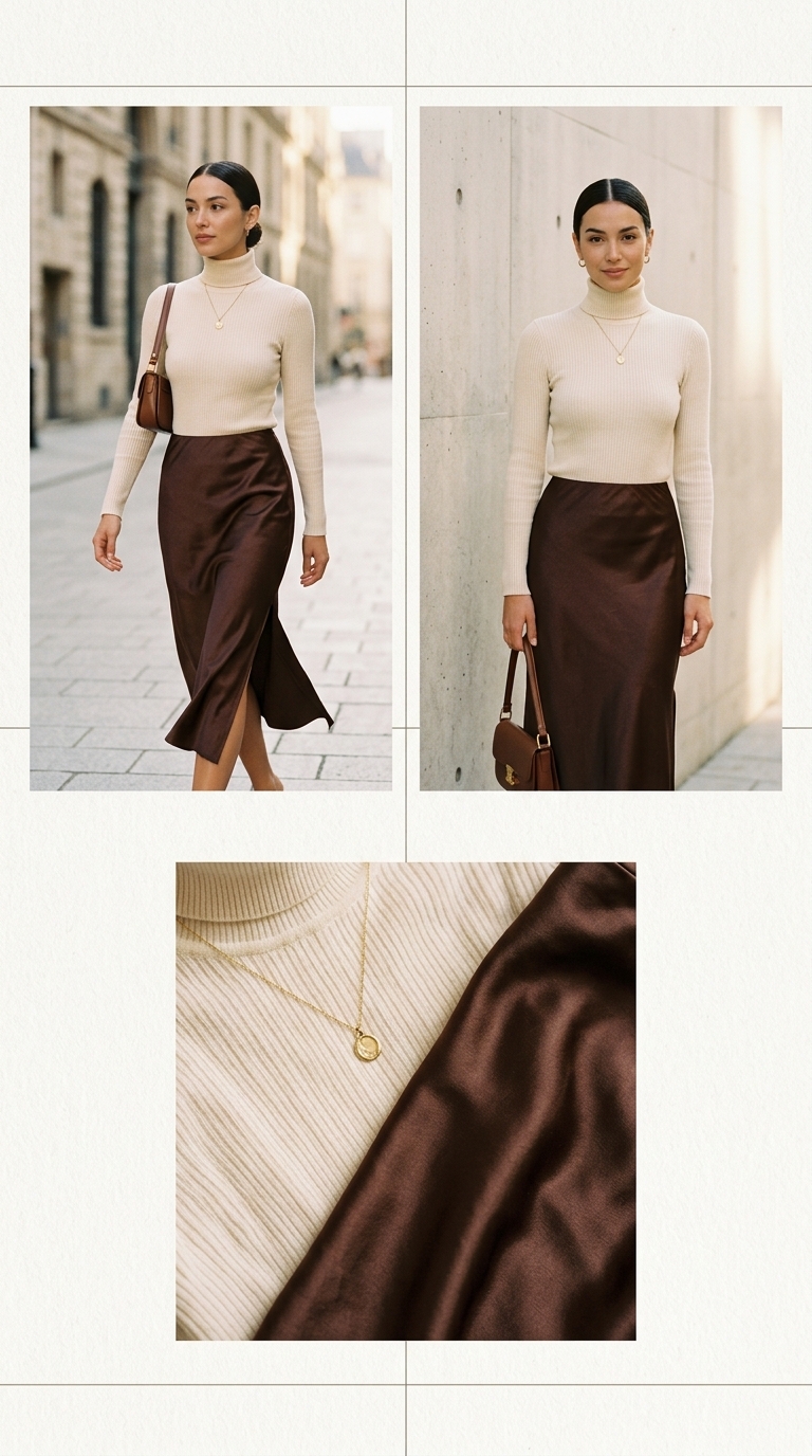 A ribbed turtleneck layered with a satin midi skirt reads soft luxury—comfy at the top, effortlessly chic at the bottom. The warm cream and cocoa/wine contrast looks expensive in photos and feels smooth on-body. Finish with a delicate necklace and small bag so the whole look is polished, but still slightly undone in that signature way.