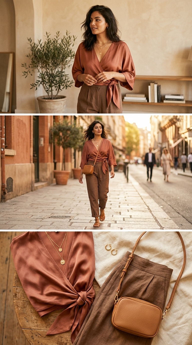 A wrap top with a slightly undone tie gives movement and glow, while relaxed mocha trousers keep the silhouette elegant and effortless. The muted rose/terracotta color looks flattering on every skin tone and feels very Pinterest-native—romantic without being overly styled. Finish with tousled hair and a sleek crossbody so the whole outfit feels calm, flirty, and ready to go.