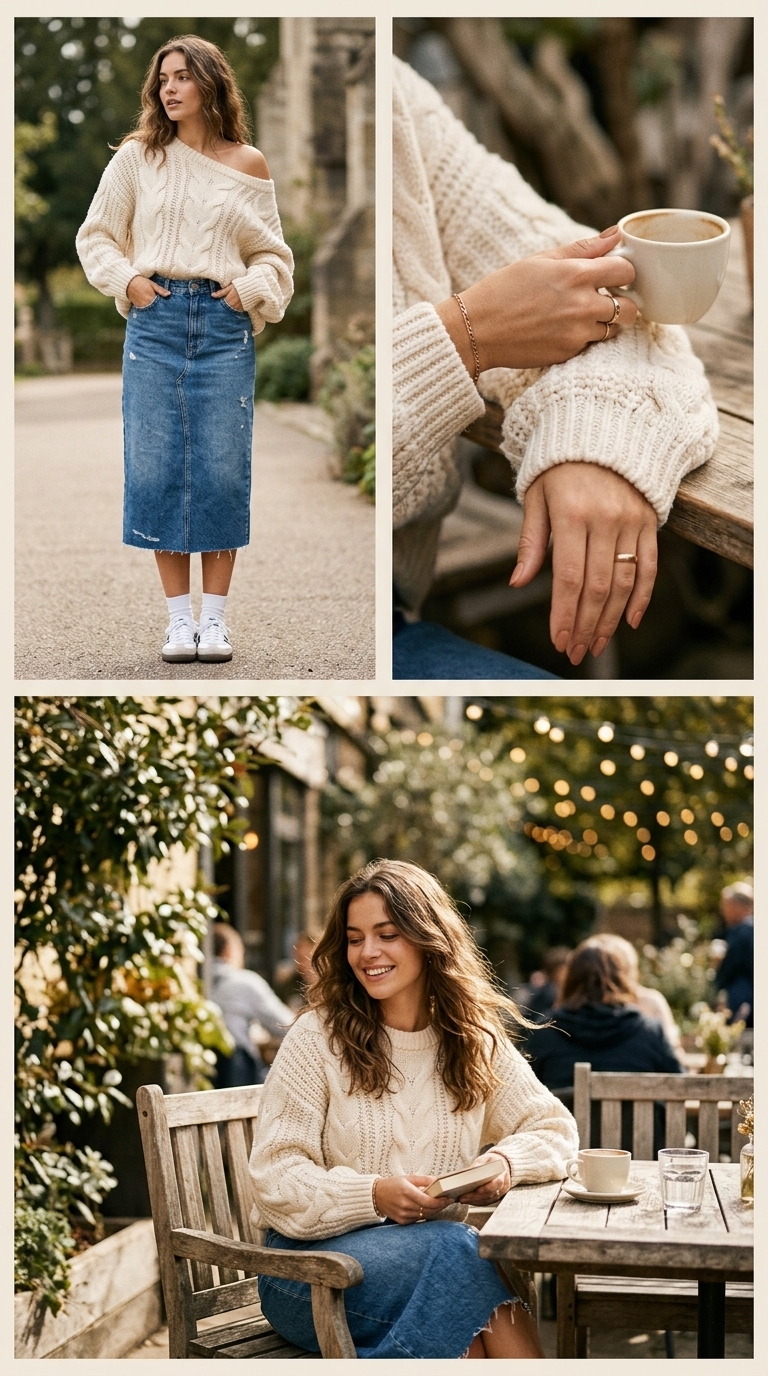 Denim skirt + a cozy knit layer feels like undone elegance in its most wearable form. Let the sweater slip slightly for that “I didn’t plan this, but it looks perfect” energy, while the skirt keeps the outfit youthful and structured. Warm nude beauty and minimal jewelry make it look intentionally styled without being too polished.