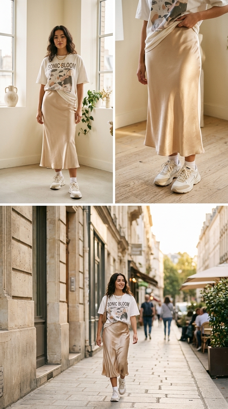A champagne satin slip skirt brings the luxe, while a graphic tee adds that intentionally casual contrast. The slight tuck and soft drape make the whole outfit feel undone in the best way—effortless, photo-friendly, and easy to style. It’s playful elegance that works for daytime plans and still looks elevated enough for evening hangs.