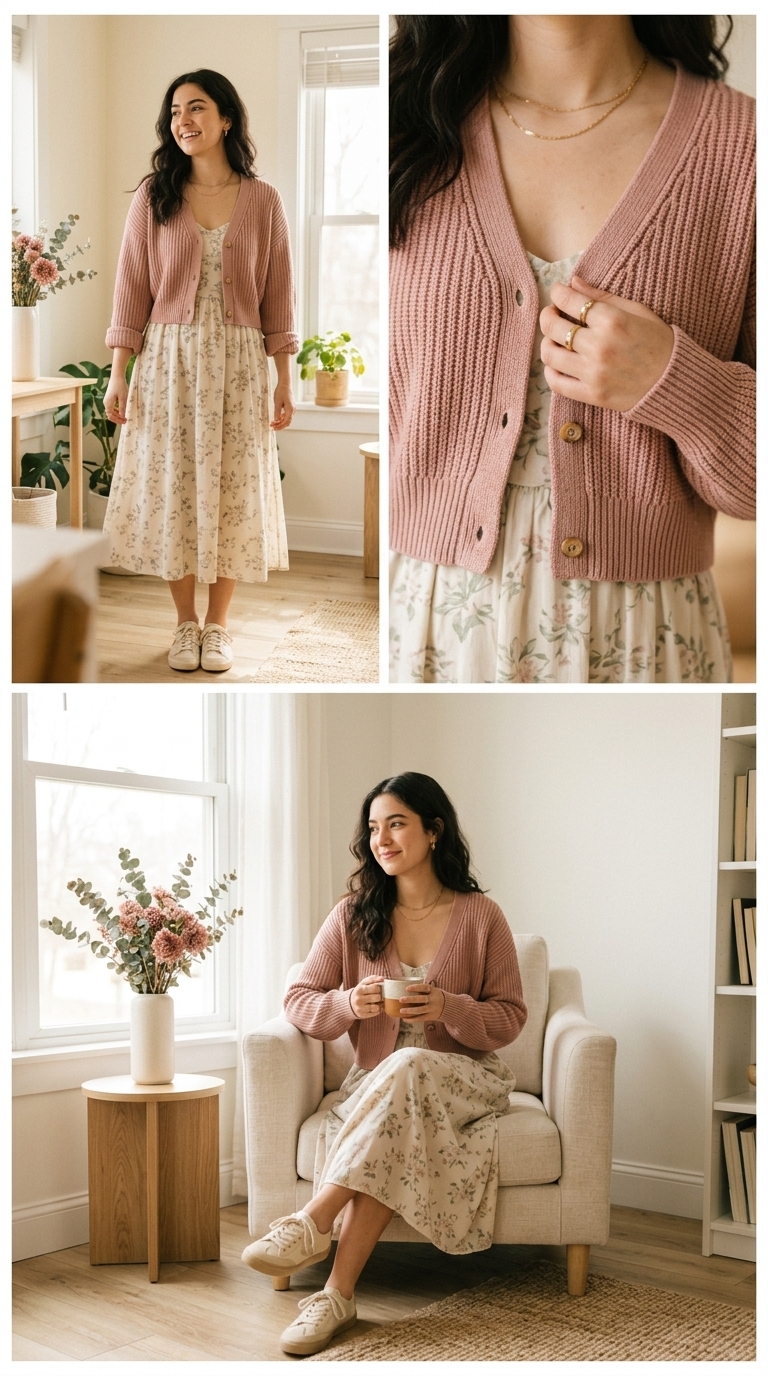 Layering a cropped cardigan over a loose midi dress turns “basic” into undone elegance instantly. The cardigan defines the frame while the midi length keeps the look romantic and airy. Think soft sage/dusty pink tones, gentle textures, and natural, effortless styling that feels timeless yet very Gen Z in its calm, artsy vibe.