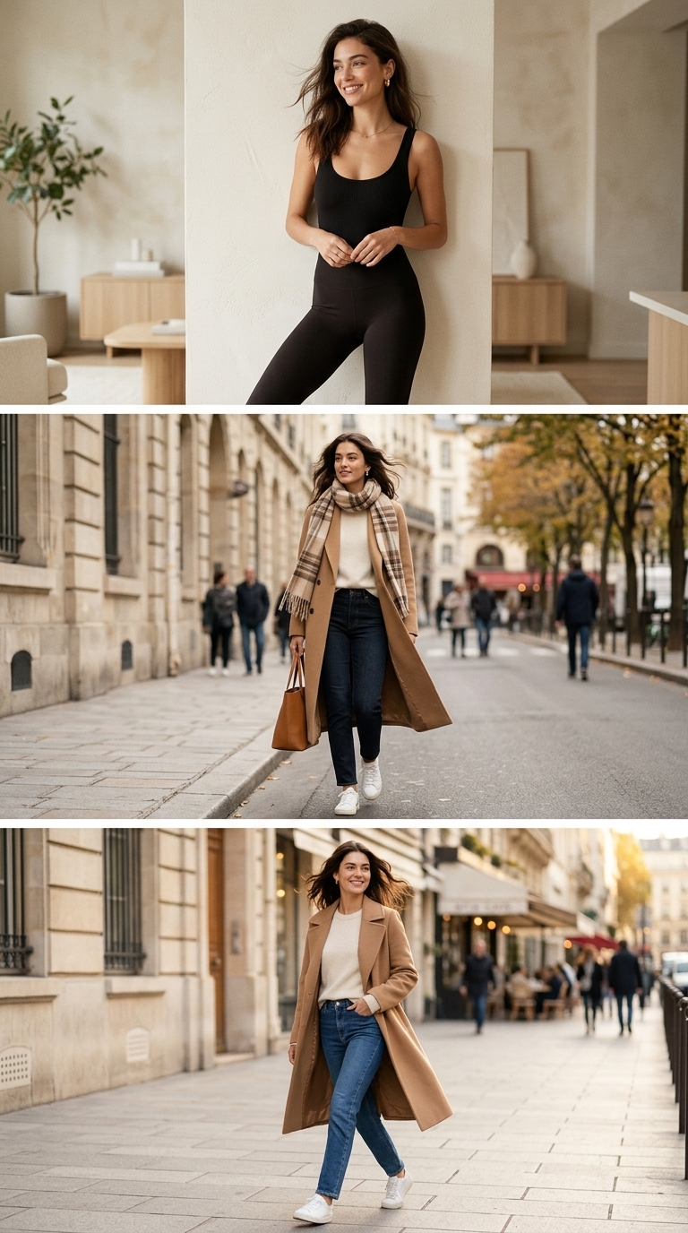Second-skin leggings under a longline oat coat is the undone elegance shortcut—sleek, streamlined, and effortlessly chic. Let the coat hang open for a soft, relaxed shape and add a loosely draped scarf to make it feel styled, not sporty. This is that “I woke up like this” outfit that still photographs expensive.