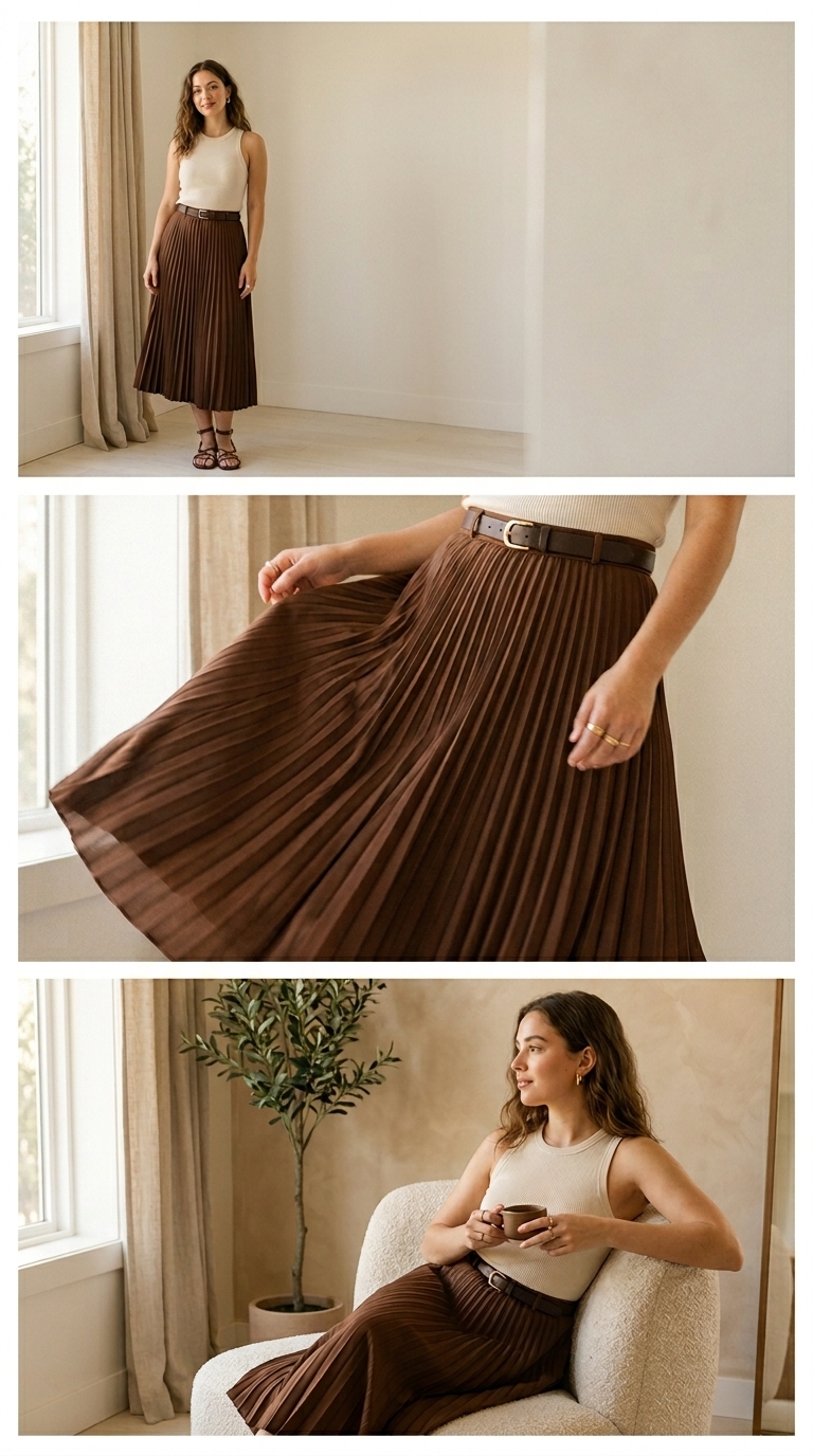 A pleated midi skirt plus a slim tank is undone elegance with movement—every step catches light and texture. Warm caramel/chocolate tones feel rich and flattering while cream keeps the look bright and wearable. Add subtle jewelry and strappy sandals to make it feel date-ready but still effortless.